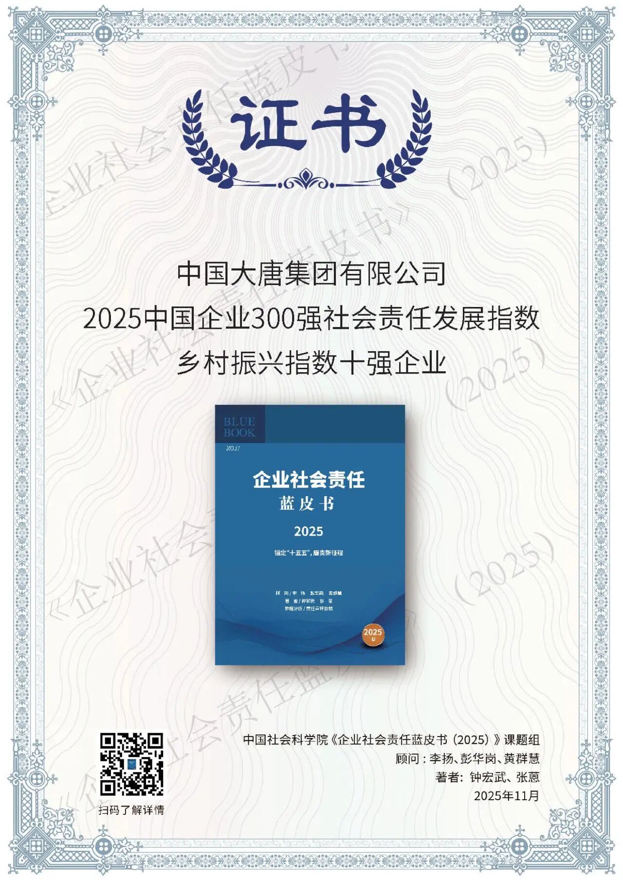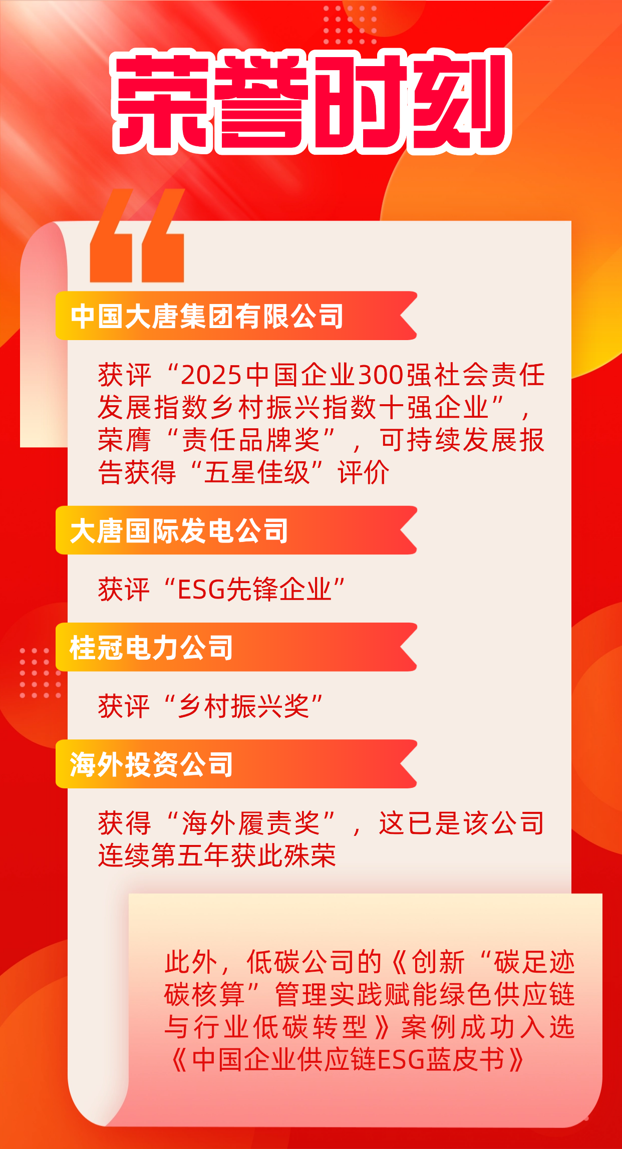 11月20日至21日,“錨定‘十五五’,履責新征程——ESG中國·第八屆北京責任展”在北京成功舉行。活動期間,正式發(fā)布《企業(yè)社會責任藍皮書(2025)》,舉辦“責任之夜——責任鯨牛獎”頒獎典禮,召開社會責任報告峰會會議。中國大唐斬獲六個獎項,一個優(yōu)秀案例入選《中國企業(yè)供應鏈ESG藍皮書》。