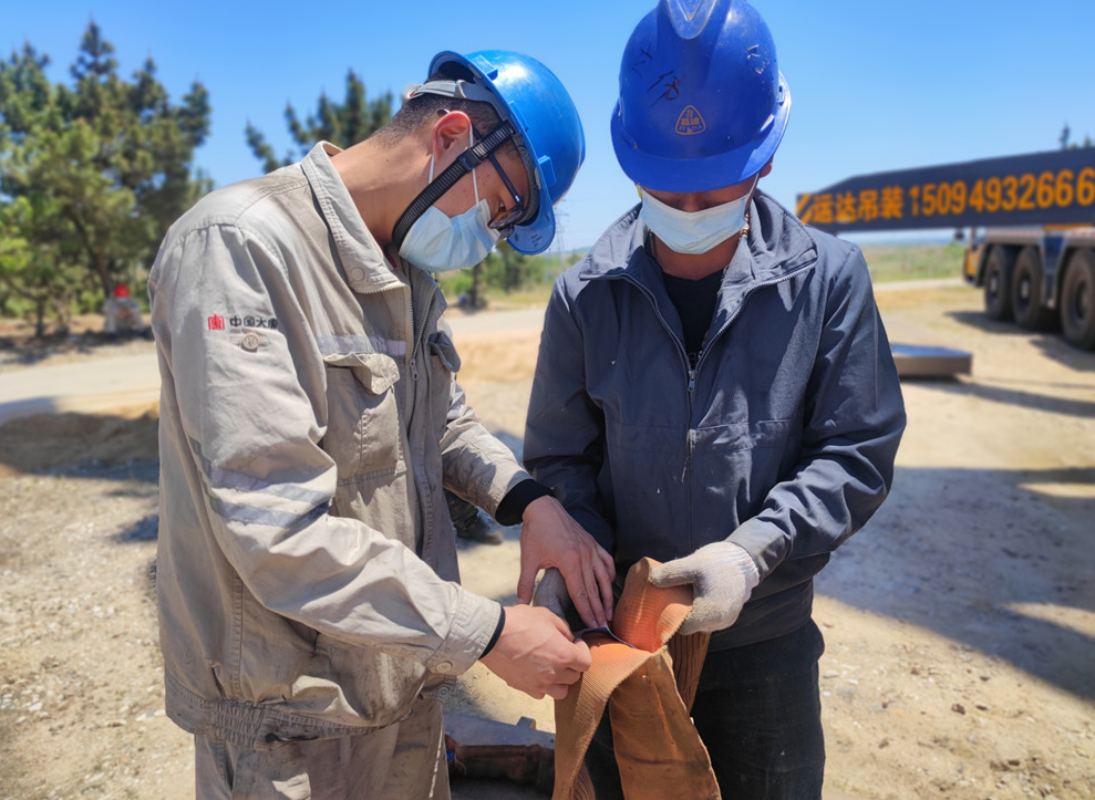 萊州一期技改現(xiàn)場,監(jiān)察人員在吊裝前對吊帶進(jìn)行安全檢查(劉思洋/攝)