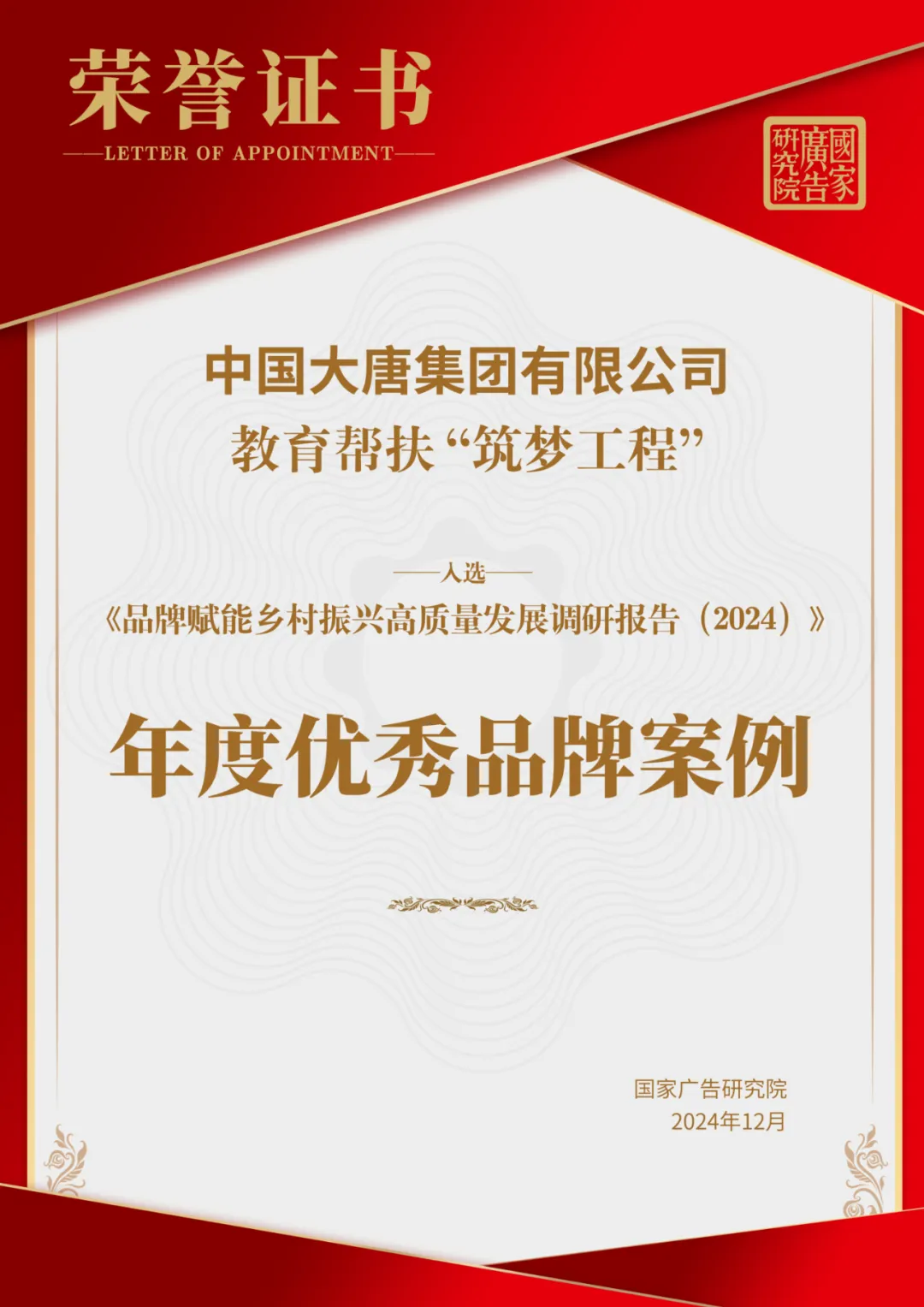 本網(wǎng)訊??近日,由中國(guó)廣告協(xié)會(huì)指導(dǎo),國(guó)家廣告研究院與新華網(wǎng)鄉(xiāng)村振興研究院聯(lián)合主辦的《品牌賦能鄉(xiāng)村振興高質(zhì)量發(fā)展研究報(bào)告(2024)》發(fā)布暨鄉(xiāng)村振興品牌發(fā)展評(píng)價(jià)指標(biāo)體系論證會(huì)在京舉行,會(huì)上發(fā)布了2024年度優(yōu)秀品牌案例。憑借在品牌賦能鄉(xiāng)村振興工作中的突出表現(xiàn),《中國(guó)大唐教育幫扶“筑夢(mèng)工程”》入選年度優(yōu)秀品牌案例。